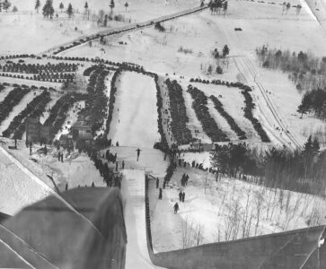 A view from the top of the Pine Mountain ski jump is shown during a 1940s event. The Kiwanis Ski Club has hosted world-class competitions at Pine Mountain since 1939. This year’s FIS Continental Cup tournament is set for Feb. 20-22. Buttons are available online at www.kiwanisskiclub.com. Sanford Health Marshfield Clinic is the title sponsor. (Photo provided by the Menominee Range Historical Museum in Iron Mountain)