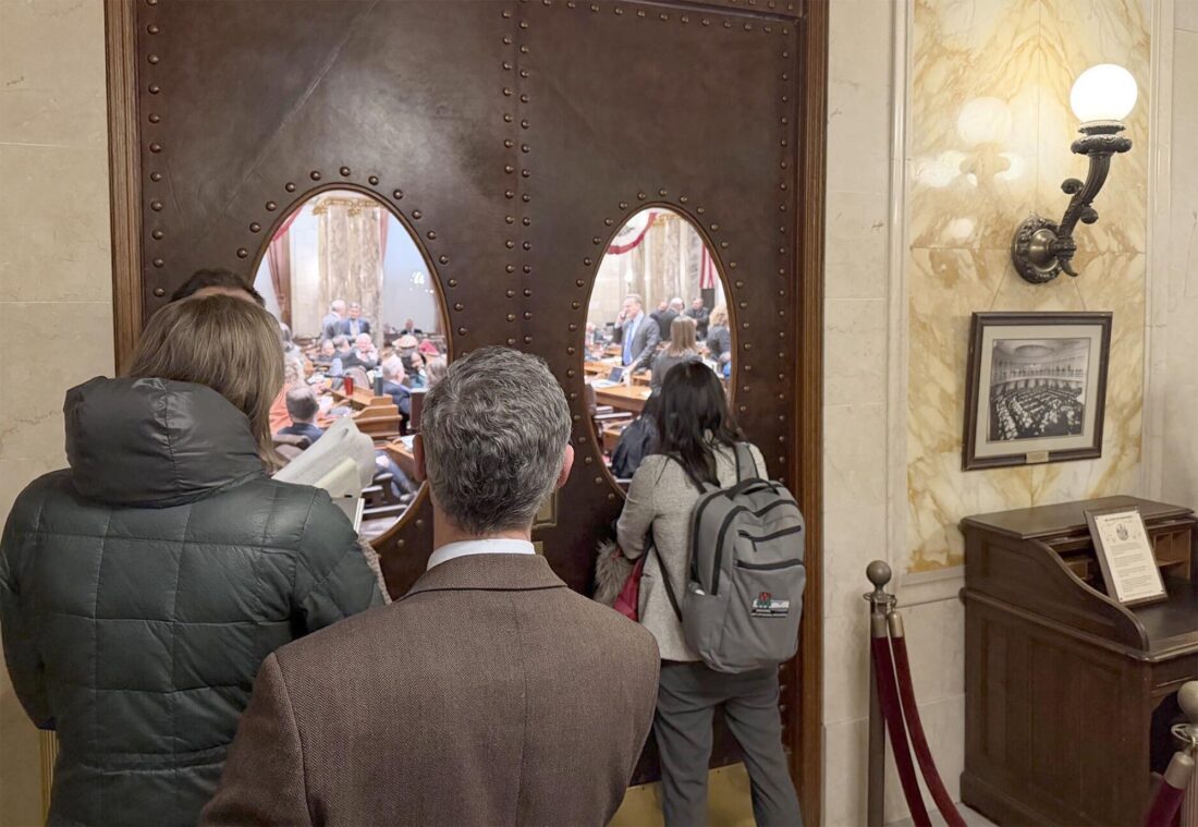 Wisconsin Department of Natural Resources Secretary Karen Hyun peers through the window after the state Assembly passed one of two PFAS bills Friday. (Henry Redman | Wisconsin Examiner)