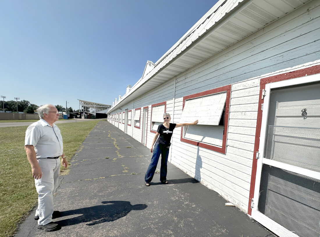 Friends of the Dickinson County Fair President Lisa Bedard and Dickinson County Fair Board member Rob Barkle take a look at “concession row” on the Dickinson County Fairgrounds in Norway before the start of the 2025 fair. In a split decision, the Dickinson County Fair Board has decided to remove the structure built in 1939. (Terri Castelaz/Daily News, file)