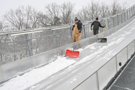 - Volunteers clean snow Friday from the scaffold at Giant Pine Mountain ski jump. By early afternoon, official training for the Sanford Health Marshfield Clinic FIS Continental Cup was canceled due to weather conditions. (Dave Kallmann photo)