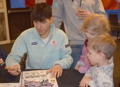 - Max Unglaube of Germany signs an autograph for Victoria O’Malley, 8, and Emmett O’Malley, 4, of New York at the Meet the Skiers event Thursday at Pine Mountain Golf and Ski Resort. (Marguerite Lanthier/Daily News)