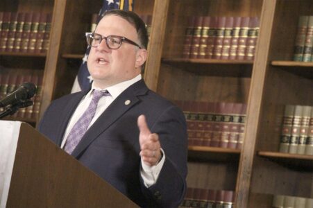 Three athletes prepare to head up for another training jump Thursday at Pine Mountain. A field of 40 jumpers will compete this weekend in the Sanford Health Marshfield Clinic FIS Continental Cup. Official training jumps were scheduled today at Giant Pine, although snow and gusty winds were in the forecast. Calmer conditions are expected Saturday and Sunday, with a high near 31 on Saturday and 25 on Sunday. In the second photo, Max Unglaube of Germany signs an autograph for Victoria O’Malley, 8, and Emmett O’Malley, 4, of New York at the Meet the Skiers event Thursday evening at Pine Mountain Golf and Ski Resort. In the final photo, Tom Nagy, CEO of M.J. Electric, spreads wood chips in his company’s hospitality area in a prime spot near the end of the outrun at Pine Mountain.