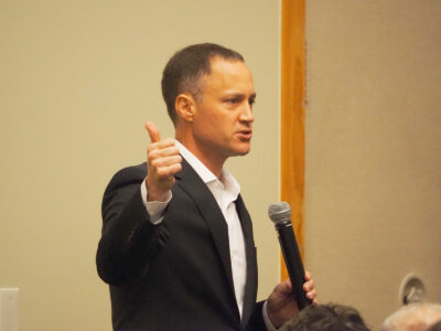 Michigan gubernatorial candidate Tom Leonard speaks to a crowd of Republican party fixtures at a dinner Aug. 8 honoring the late state Sen. George McManus at Great Wolf Lodge in Traverse City, Mich. (Ben Solis/Michigan Advance, file)