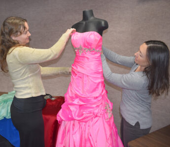- Dickinson County Library Public Relations Specialist Maggie Mooney, left, and Interlibrary Loan Specialist Nikki Younk get a mannequin ready for next week’s Prom Dress Swap. (Terri Castelaz/Daily News)