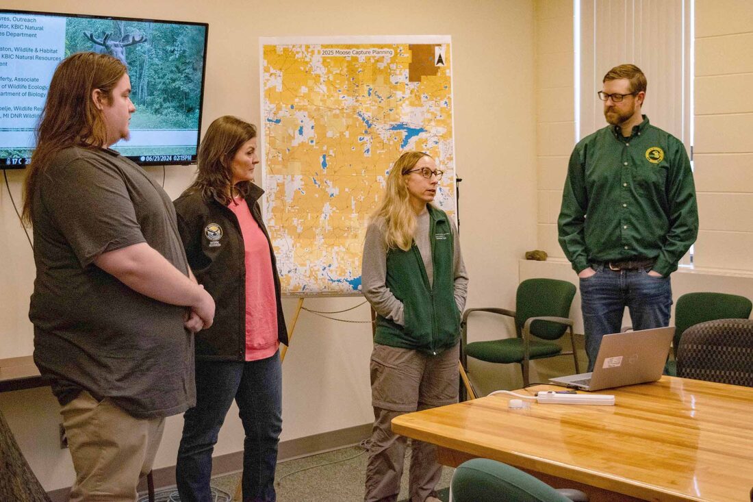 - From left, project leads from the Keweenaw Bay Indian Community, Northern Michigan University and the Michigan Department of Natural Resources talk about the moose collaring effort with the media. (Photo provided by Michigan DNR)