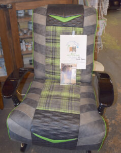 A chair that has been reupholstered is on display at the Habitat for Humanity Menominee ReStore in Kingsford. It will be available at the Flip it Forward Art & Auction set for March 12 at the Knights of Columbus Hall in Kingsford. (Marguerite Lanthier/Daily News)