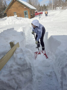 Sherry Tregillis wielded a shovel at several Six Mile Lake homes Tuesday after her husband, Lee, had labored to cut paths with a snowblower through more than 2 feet drifts, shaped by the high winds Monday.