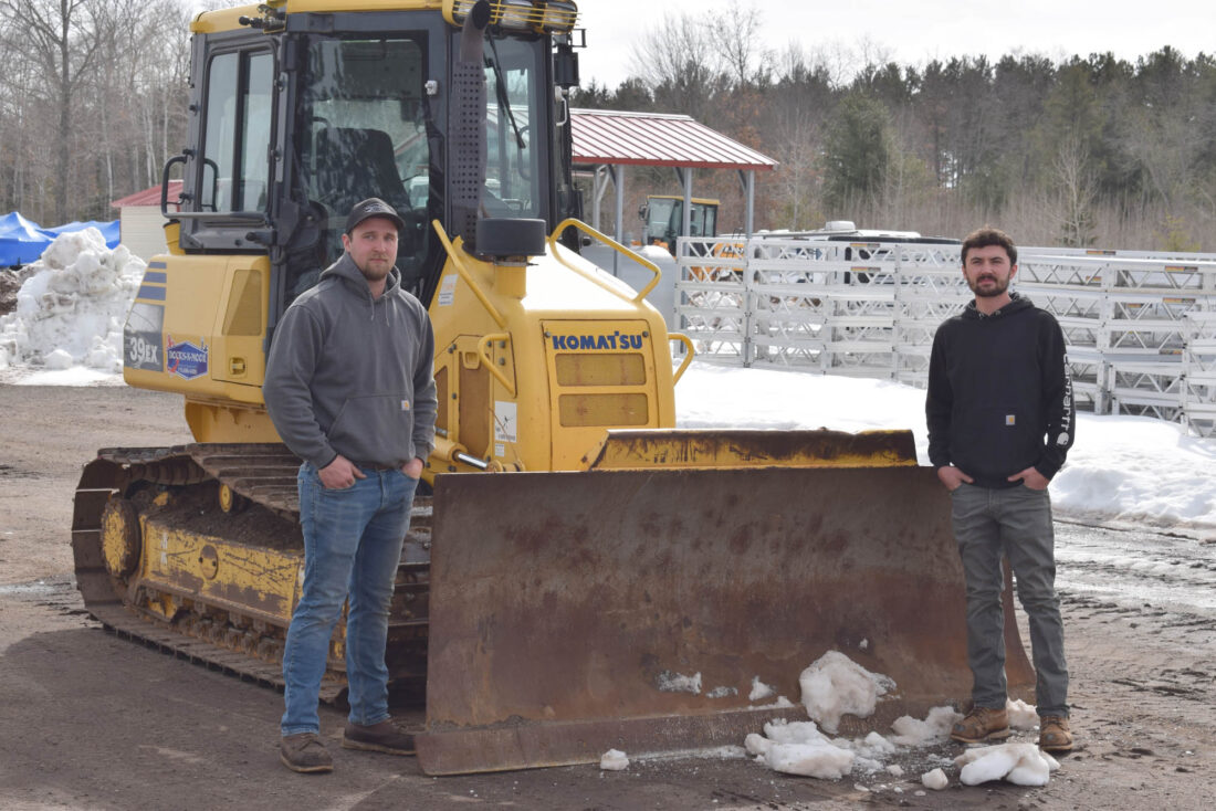 Andy Anderson, left, and Anthony Krans stand in front of a bulldozer at their business, Docks-N-Moor in Florence, Wis. They sell and install docks and boat lifts, as well as provide a variety of landscaping services. (Marguerite Lanthier/Daily News)