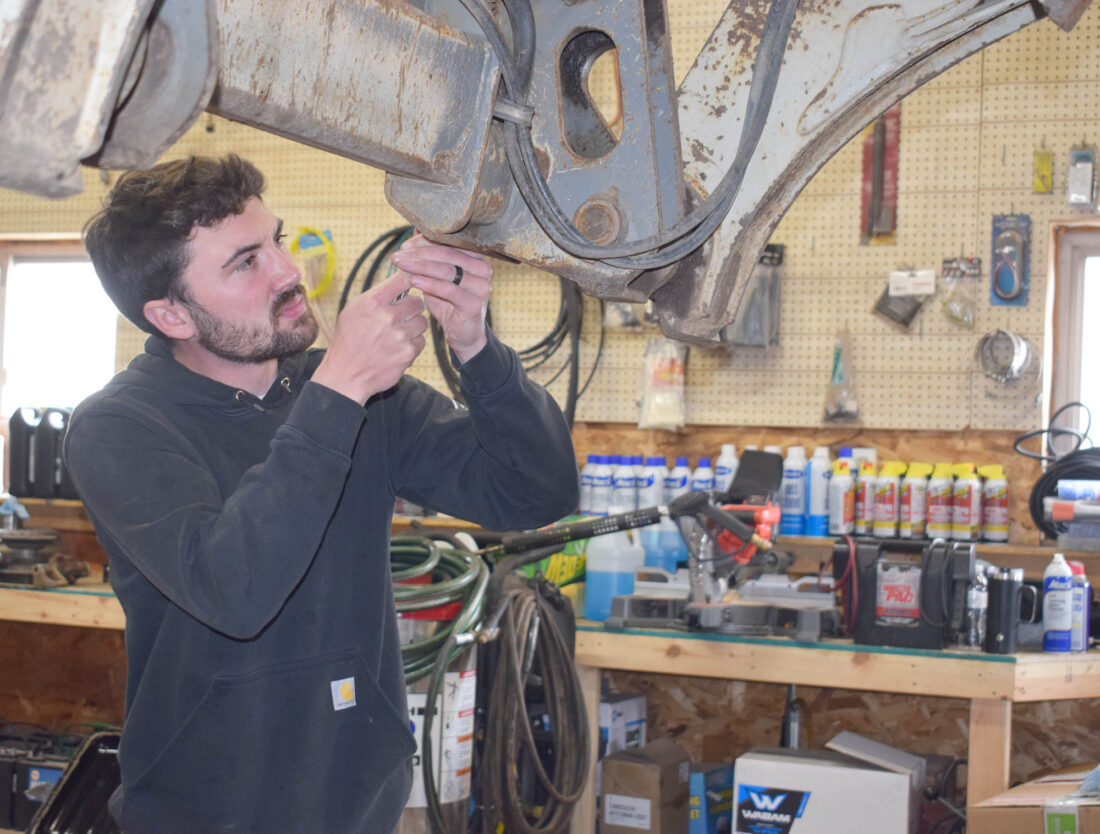 Anthony Krans works on a piece of equipment at Docks-N-Moor in Florence, Wis. He owns the business with his partner, Andy Anderson. (Marguerite Lanthier/Daily News)
