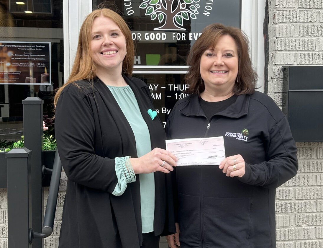 The Dickinson Area Community Foundation, along with affiliates Crystal Falls Area Community Foundation, and Norway Area Community Foundation, recently awarded a $500 Community Impact Grant. The funds were made possible with a matching grant from the Pasahow Family Fund. The grant will assist in acquiring breastfeeding essentials kits for new mothers in Dickinson and Iron counties. Amber Grassinger, left, senior WIC and breastfeeding counselor with the Dickinson-Iron District Health Department, accepting the check from Tamara Juul, director of the DACF. The foundation's mission is to enhance and strengthen local communities now and for generations to come. For more information on available funding, contact Juul at 906-774-3131 or go to the DACF website at www.dickinsonareacf.org.