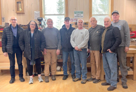 Pine Creek Woodworking of Breitung Township received a $9,125 grant from the Michigan Arts and Culture Council. Friends of The Braumart member Liz Murray is shown with Pine Creek Woodworking board members — from left are Albert Santoni, Murray, Tom Wender, John Fortier, Dave Wender, Steve Pontbriand, Ted Fornetti and Mark Pugh. (Contributed photo)