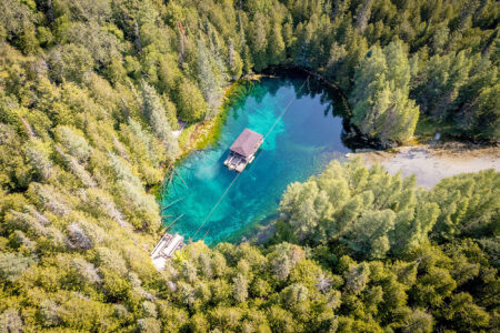 - A $150,000 Trust Fund grant in 2000 was used to build a manually propelled raft that allows visitors to cross and view the clear waters of the “Big Spring” at Palms Book State Park in Schoolcraft County. (Tyler Leiprandt and Michigan Sky Media LLC, in cooperation with the Michigan Department of Natural Resources)