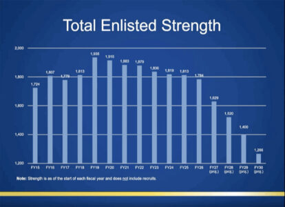 Grady showed statistics about the total enlisted strength of the department, which peaked in fiscal year 2019 at 1,935 and has decreased each year since, sitting at 1,784 in fiscal year 2026. Full staffing for the department would be 2,000 enlisted members, he said.