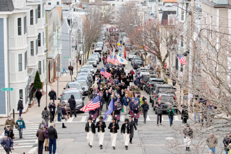 A procession marches up Telegraph Street on March 17 in Boston in an Evacuation Day ceremony marking the 1776 departure of British troops from the city during the American Revolutionary War. (AP Photo/Robert F. Bukaty)