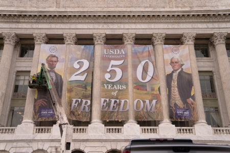 - Crews fix the banners in front of the Department of Agriculture on March 20 in Washington. (AP Photo/Allison Robbert)