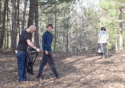 - Volunteers — from left are Matthew Korpi, Andrew Korpi and Audrey Smith — collect garbage Wednesday on the cross country ski trail at City Park on Earth Day. (Marguerite Lanthier/Daily News photo)