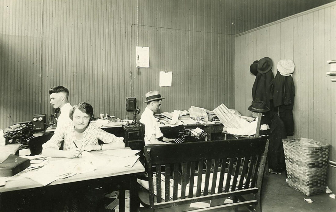 The Iron Mountain News was established on April 11, 1921, by Frank J. Russell Sr. Shown here is the Editorial Department office of the newly established newspaper, taken in about 1922. Thomas J. Masterson, managing editor, was at his typewriter at the left and the man wearing the hat was probably Clyde J. McCauley, telegrapher and sports editor. The woman at the lower left is Violet (Serena) Tomassoni. Russell purchased The Tribune-Gazette and The Iron Mountain Press, which were merged into the new newspaper. The Tribune was started in 1897, and The Gazette was founded in 1896, the same year as The Iron Mountain Press. Thus, The Iron Mountain News was, in essence, a merger of three early Iron Mountain newspapers. (Photo courtesy of the Menominee Range Historical Museum)