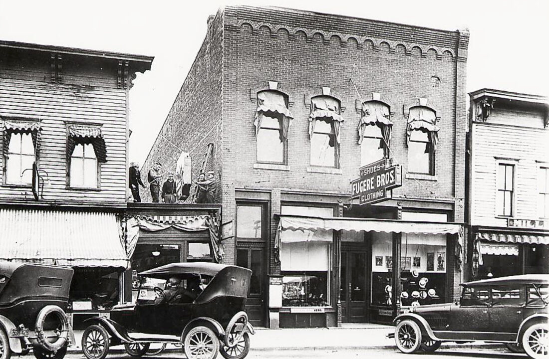 - Probably taken in the early to mid-1920s, this photograph shows a number of businesses on the east side of the 300 block of South Stephenson Avenue in Iron Mountain: 305, Michael Khoury, confectioner; 307, William Riley, newsstand; 311, Fugere Bros., men’s furnishings and shoes; 313, Fugere Bros., men’s furnishings and shoes. Workmen were hanging a new sign atop Riley’s newsstand. The store next to Fugere Bros. has the letters “MILL” visible above the awning and may have been the location of the Miller Agency, dealing in insurance. Note the men’s straw hats in the Fugere Bros.’ window. (Gene Derwinski/Dick Ferris)