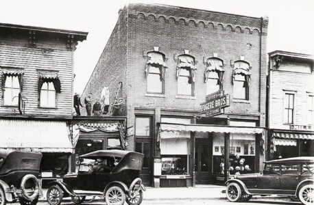 Probably taken in the early to mid-1920s, this photograph shows a number of businesses on the east side of the 300 block of South Stephenson Avenue in Iron Mountain: 305, Michael Khoury, confectioner; 307, William Riley, newsstand; 311, Fugere Bros., men’s furnishings and shoes; 313, Fugere Bros., men’s furnishings and shoes. Workmen were hanging a new sign atop Riley’s newsstand. The store next to Fugere Bros. has the letters “MILL” visible above the awning and may have been the location of the Miller Agency, dealing in insurance. Note the men’s straw hats in the Fugere Bros.’ window. (Gene Derwinski/Dick Ferris)