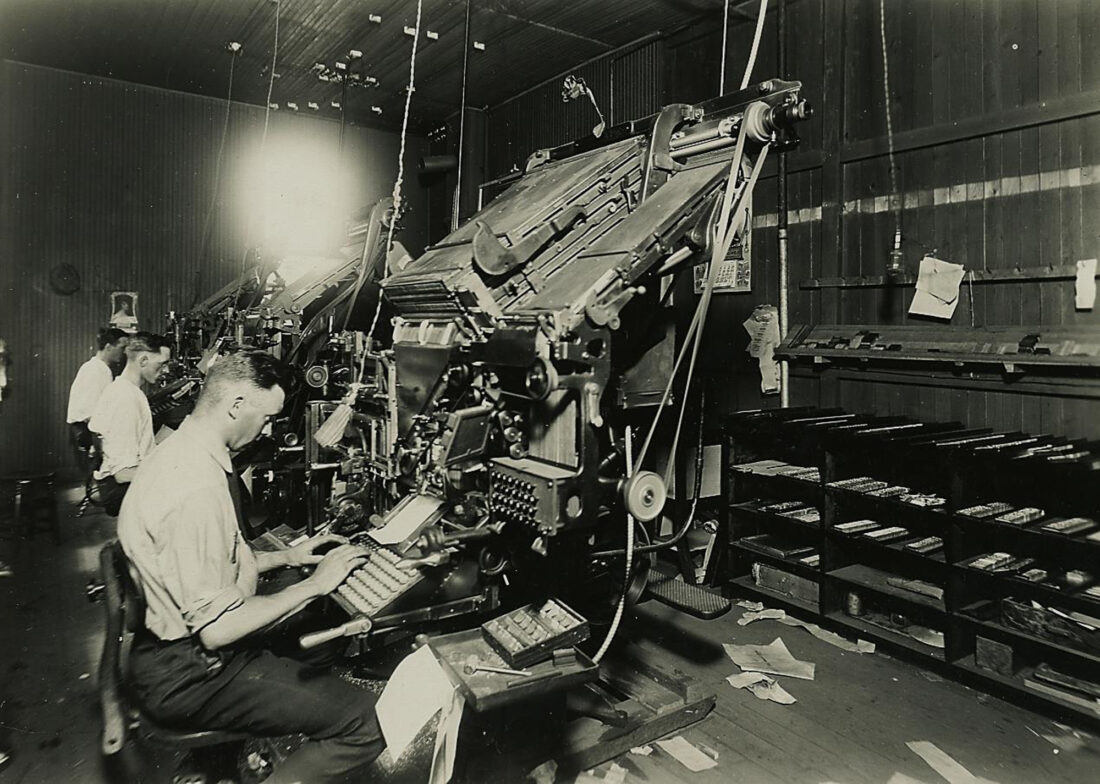 - Albert P. Miller, front, was a linotype machine operator at The Iron Mountain News, shown here in about 1922. The two men in the background are unidentified. The linotype machine, invented in 1884, used a keyboard to assemble the casting matrices, and cast an entire line of type at a time — hence its name. The Iron Mountain News began operations using “hot type” letterpress printing presses and manual typewriters. The operators typed the copy written by the reporters and “slugs” of type – literally a line of type – were automatically cast and dropped into columns. The lead was melted and reused with each edition of the newspaper. The Iron Mountain News switched to “cold type” or an offset printing press on March 9, 1975. The Iron Mountain printing presses were dismantled when the Powers Printing Company facility began operations in July 1977. (Photo courtesy of the Menominee Range Historical Museum)