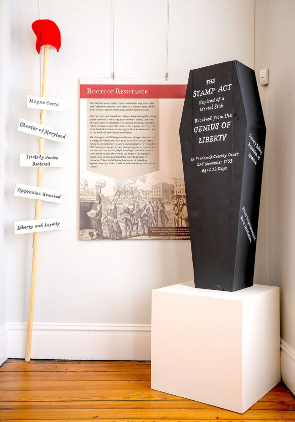 - An exhibit at the Heritage Frederick historical society on Frederick’s contributions to the Revolutionary War shows a casket of the type used for a 1765 mock funeral to protest the Stamp Act, a British tax imposed on the colonies. (Ric Dugan/Frederick News-Post photo)