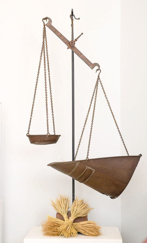 An exhibit at the Heritage Frederick historical society on Frederick’s contributions to the Revolutionary War shows a grain scale from a mill that belonged to Philip Feaga, a German farmer. Feaga, who purchased the mill property in 1785, was a Hessian ally for the British during the American Revolution, according to the Maryland Historical Trust. (Ric Dugan/Frederick News-Post photo)