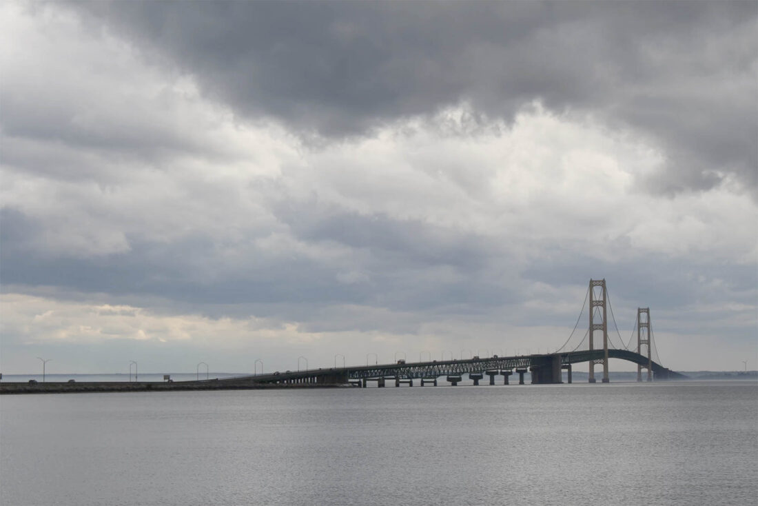 Enbridge’s Line 5 splits into twin pipelines just west of the Mackinac Bridge, and crosses along the Straits of Mackinac lakebed for 4 miles, from the Upper Peninsula to the Lower Peninsula. (Lexi Krupp/Interlochen Public Radio)