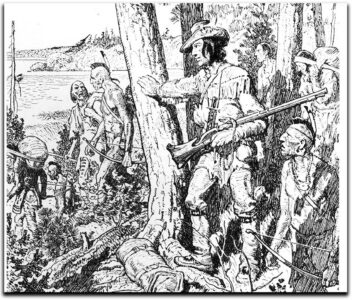 - Etienne Brule and Huron warriors at the mouth of the Humber River at Lake Ontario. (Drawing by C.W. Jefferys, via Northern Michigan University’s Beaumier U.P. Heritage Center)