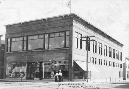 He arrived in Iron River from Watersmeet in 1897 and leased the old Bond building. His successful store quickly outgrew the building and the adjoining Gordon building was purchased, connected to the Bond building by an archway.