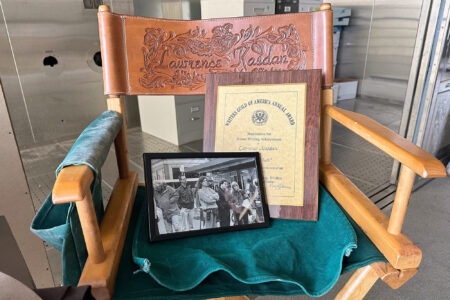 Lawrence Kasdan’s director chair is on display, along with a framed photo of him on set and his Writers Guild award, on University of Michigan campus Nov. 24 in Ann Arbor, Mich. (AP Photo/Mike Householder)