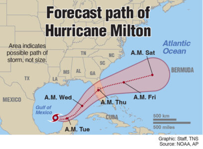 The center of Hurricane Milton could come ashore Wednesday in the Tampa Bay region, which has not endured a direct hit by a major hurricane in more than a century. Scientists expect the system to weaken slightly before landfall, though it could retain hurricane strength as it churns across central Florida toward the Atlantic Ocean. That would largely spare other states ravaged by Helene, which killed at least 230 people on its path from Florida to the Carolinas.