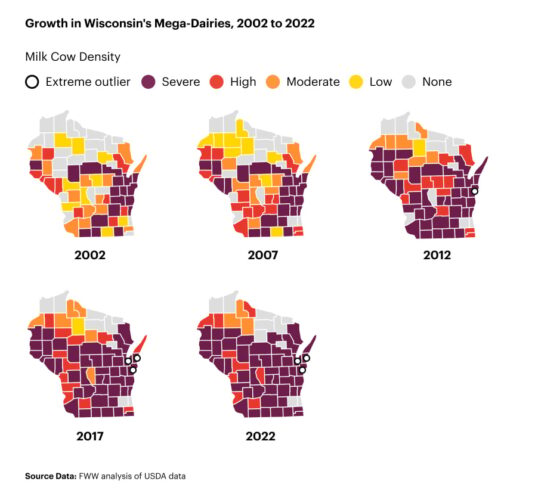 Factory farms in Wisconsin produce 33 billion pounds of waste every year, about four times the amount of waste created by the state’s human population, according to a new report by Food and Water Watch tracking the growth of factory farming across the country.