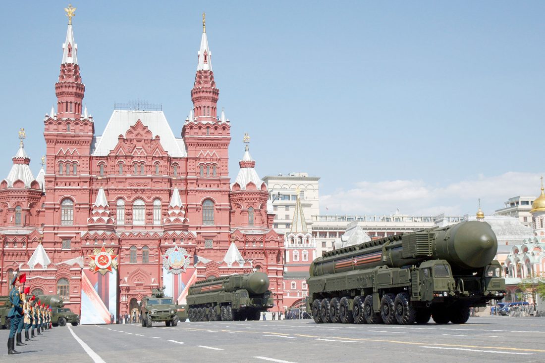 RUSSIAN ICBM MISSILE launchers move during the Victory Day military parade in May 2016 in Moscow’s Red Square as Russia marked 71 years after the victory in World War II. (AP Photo/Alexander Zemlianichenko, file)