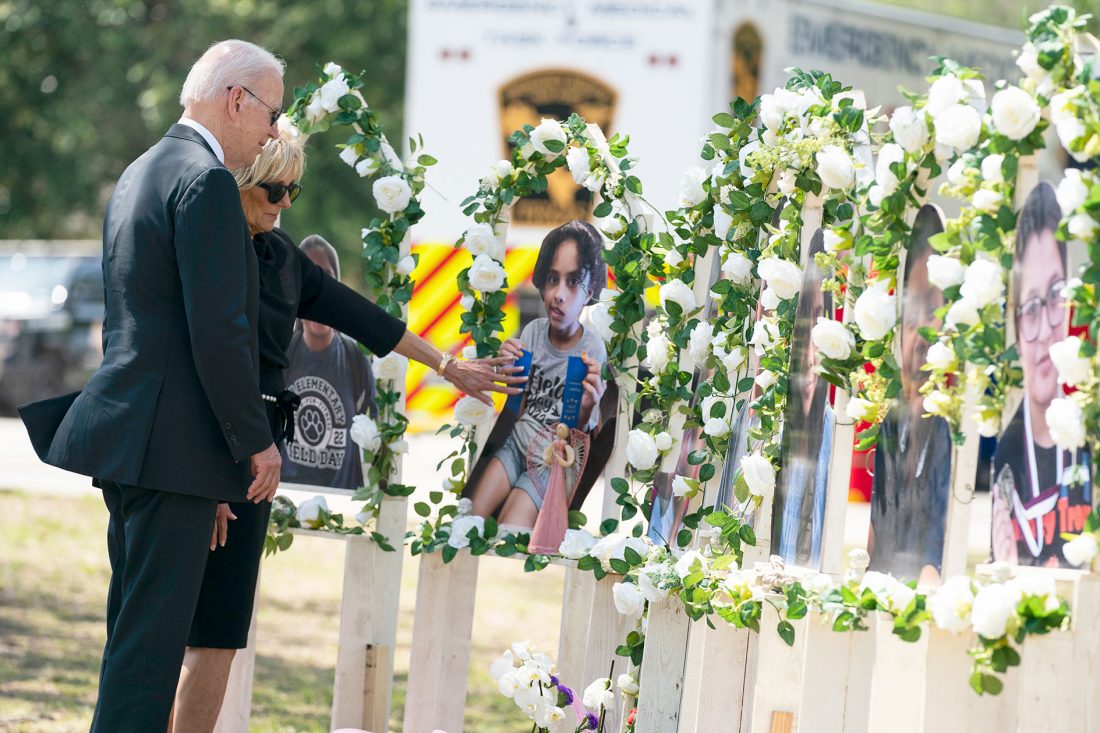 PRESIDENT JOE BIDEN and first lady Jill Biden visit a memorial at Robb Elementary School on Sunday to pay their respects to the victims of Tuesday’s mass shooting that killed 19 students and two teachers in Uvalde, Texas. The president and first lady also attended Mass at Sacred Heart Catholic Church, where several victims’ families are members. (AP Photo/Evan Vucci)