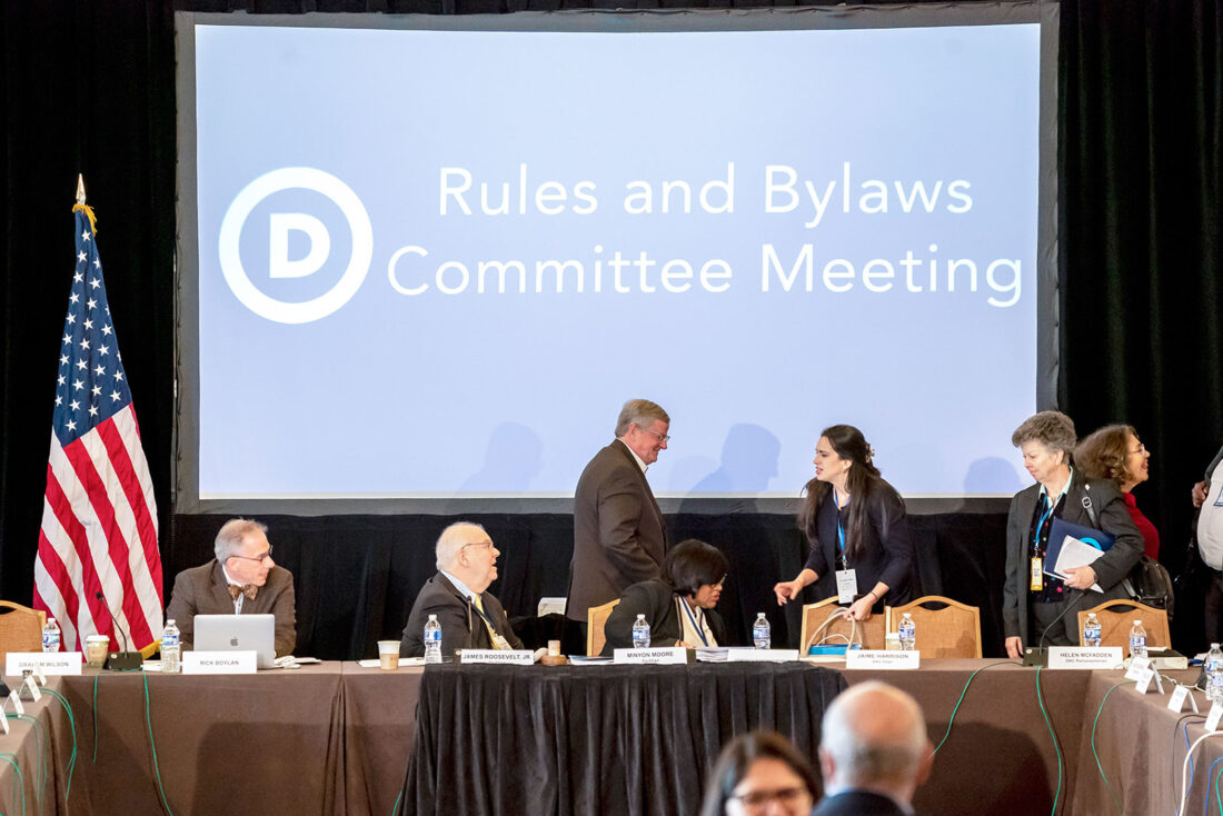 The Democratic National Committee Rules and Bylaws Committee discuss proposed changes to the primary system during a meeting Friday at the Omni Shoreham Hotel in Washington. (AP Photo/Nathan Howard)
