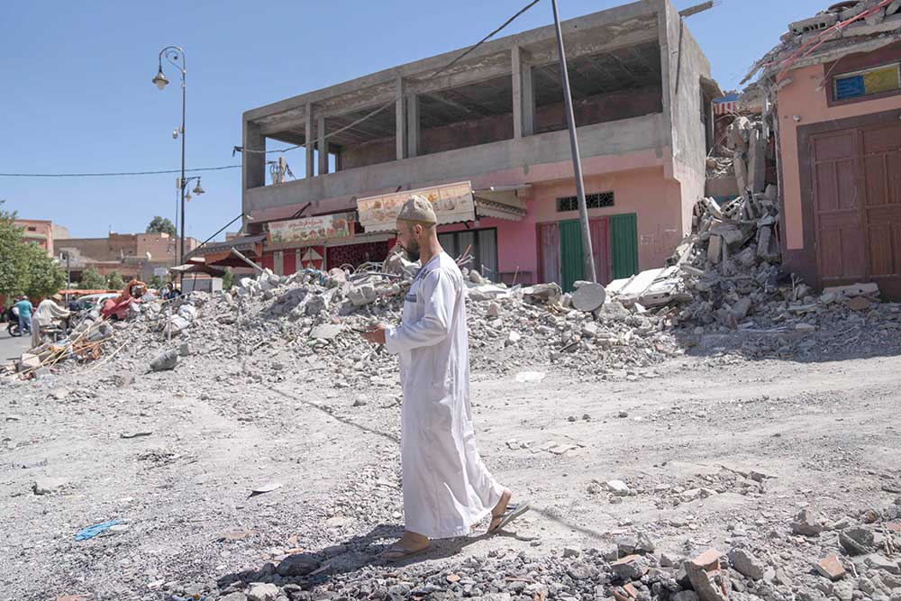 A MAN WALKS near the rubble of buildings Sunday in the town of Amizmiz, near Marrakech, Morocco, after the country was hit by the strongest earthquake in more than a century Friday night. (AP Photo/Mosa’ab Elshamy)