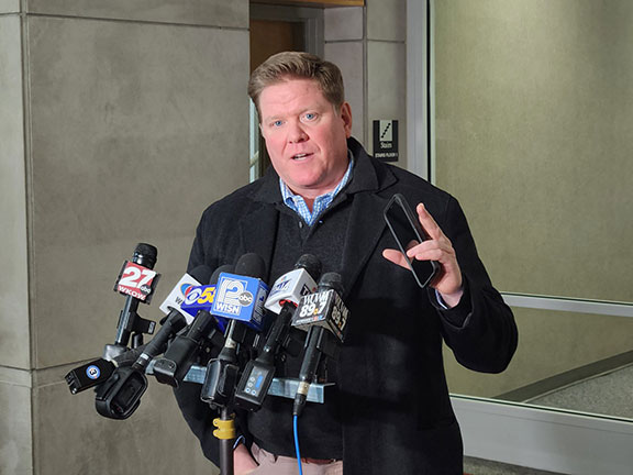 MINOCQUA BREWERY CO. owner and superPAC organizer Kirk Bangstad addresses reporters Thursday after filing a complaint with the Wisconsin Elections Commission to block Donald Trump for the 2024 presidential ballot in the state. (Erik Gunn/Wisconsin Examiner)