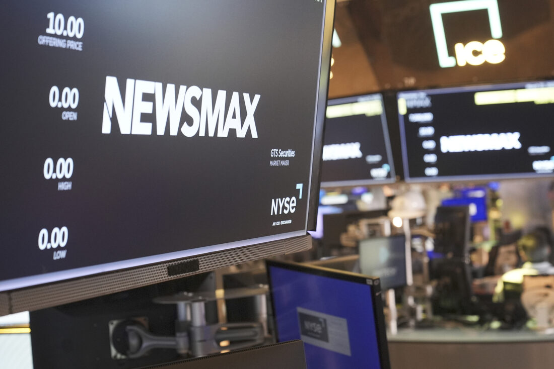 A display shows a Newsmax logo on the day of their IPO on the floor at the New York Stock Exchange on March 31 in New York. (AP Photo/Seth Wenig, file)