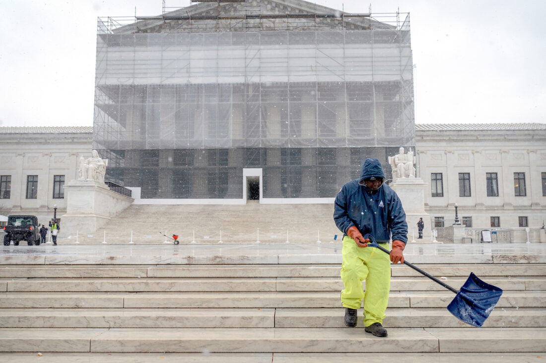 A worker shovels snow and ice in front of the Supreme Court building during the first snowfall of the winter season Friday, in Washington. (AP Photo/Mark Schiefelbein)