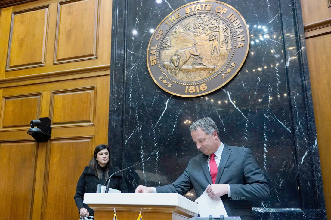 Indiana Republican House Speaker Todd Huston leaves the podium in the house chamber at the Statehouse in January 2024, in Indianapolis. (AP Photo/Darron Cummings, file)