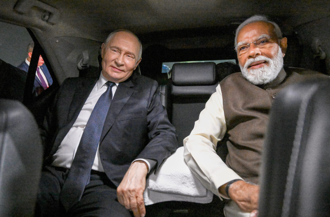 Russian President Vladimir Putin, and Indian Prime Minister Narendra Modi sit inside a limousine Thursday after arriving at the Palam Air Base in New Delhi, India. (Grigory Sysoyev, Sputnik, Kremlin pool photo via AP)