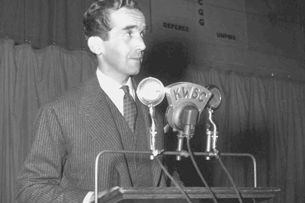 Edward R. Murrow, a CBS correspondent who made his name from the front lines of World War II and from confronting Sen. Joseph McCarthy during the 1950s Red Scare, during a speaking engagement. (AP Photo/Washington State University/The Columbian via AP)