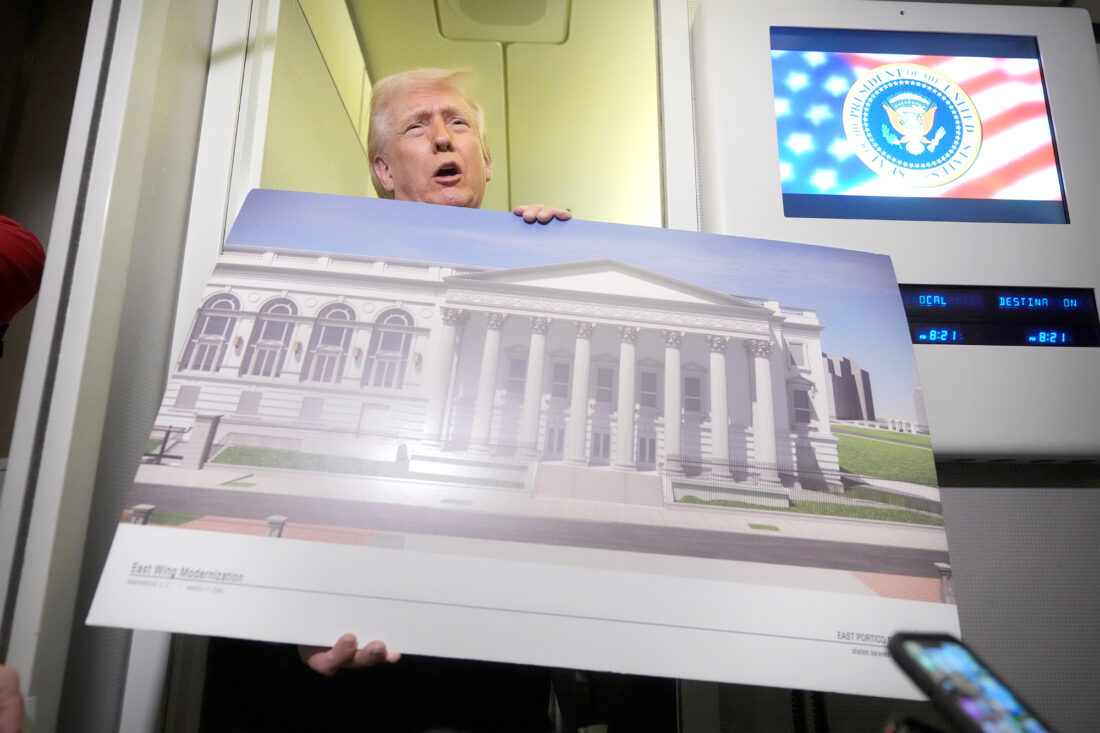 President Donald Trump holds a rendering of the proposed new East Wing of the White House as he speaks to reporters Sunday aboard Air Force One en route from West Palm Beach, Fla., to Joint Base Andrews, Md. (AP Photo/Mark Schiefelbein)