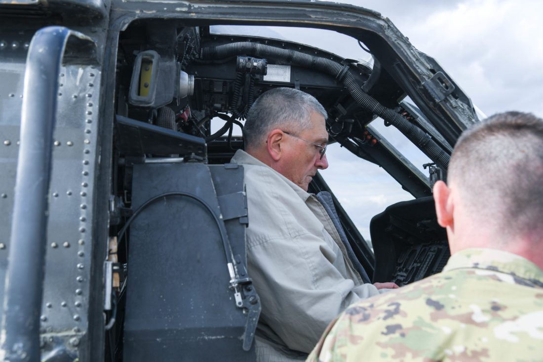 DANIEL PAUL, ACCOMPANIED by Spc. Catlin Cone at Fort Campbell, Kentucky, examines the controls of a Blackhawk helicopter.