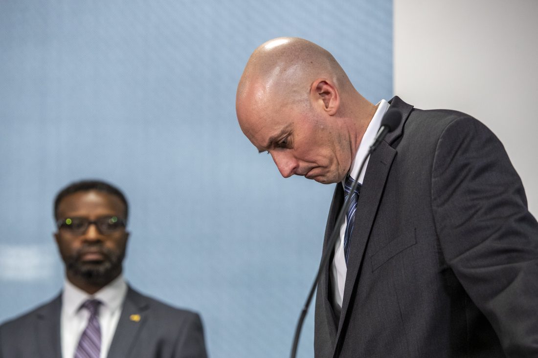 Grand Rapids Police Chief Eric Winstrom, right, and Grand Rapids City Manager Mark Washington react as a TV display shows video evidence of a Grand Rapids police officer struggling with and shooting Patrick Lyoya at Grand Rapids City Hall on Wednesday, April 13, 2022. Lyoya, 26, was shot and killed about 8:10 a.m., on April 4, after what police said was a traffic stop. (Cory Morse/The Grand Rapids Press via AP)