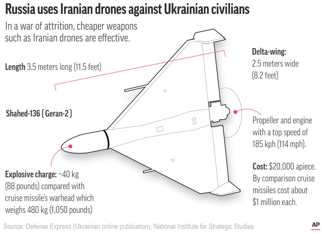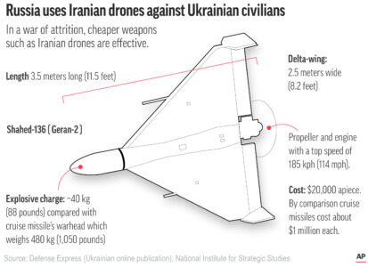 Iranian-made drones have been used elsewhere in Ukraine in recent weeks against urban centers and infrastructure, including power stations. At just $20,000 apiece, the Shahed is only a fraction of the cost of higher-tech missiles and conventional aircraft. The Kalibr cruise missile that Russia has used widely in Ukraine costs the military about $1 million each.