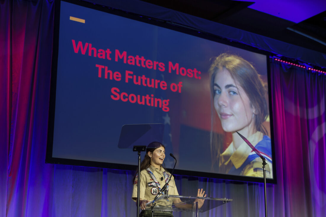 Selby Chipman, 20-year-old, speaks to the Boys Scouts of America annual meeting in Orlando, Fla., Tuesday, May 7, 2024. Chipman, a student at the University of Missouri, is an inaugural female Eagle Scout and the Assistant Scoutmaster for an all girls troop 8219 in Oak Ridge, N.C. The Boy Scouts of America is changing its name for the first time in its 114-year history and will become Scouting America. (AP Photo/Kevin Kolczynski)