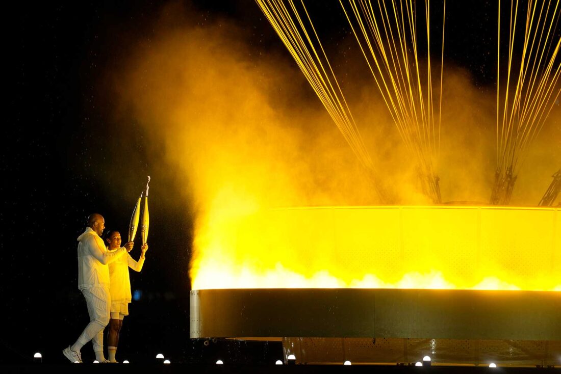- The cauldron is lit by torch bearers Marie-Jose Perec and Teddy Riner in Paris, France, during the opening ceremony of the 2024 Summer Olympics, Friday, July 26, 2024. (AP Photo/Dolores Ochoa)