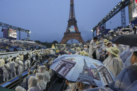 But Paris had plenty of aces up its sleeve. The Eiffel Tower, its head visible below the clouds, Notre Dame Cathedral — restored from the ashes of its 2019 fire — the Louvre Museum and other iconic monuments starred in the ceremony. Award-winning theater director Thomas Jolly, the show’s creative mind, used the signature Paris cityscape of zinc-gray rooftops as the playground for his imagination.