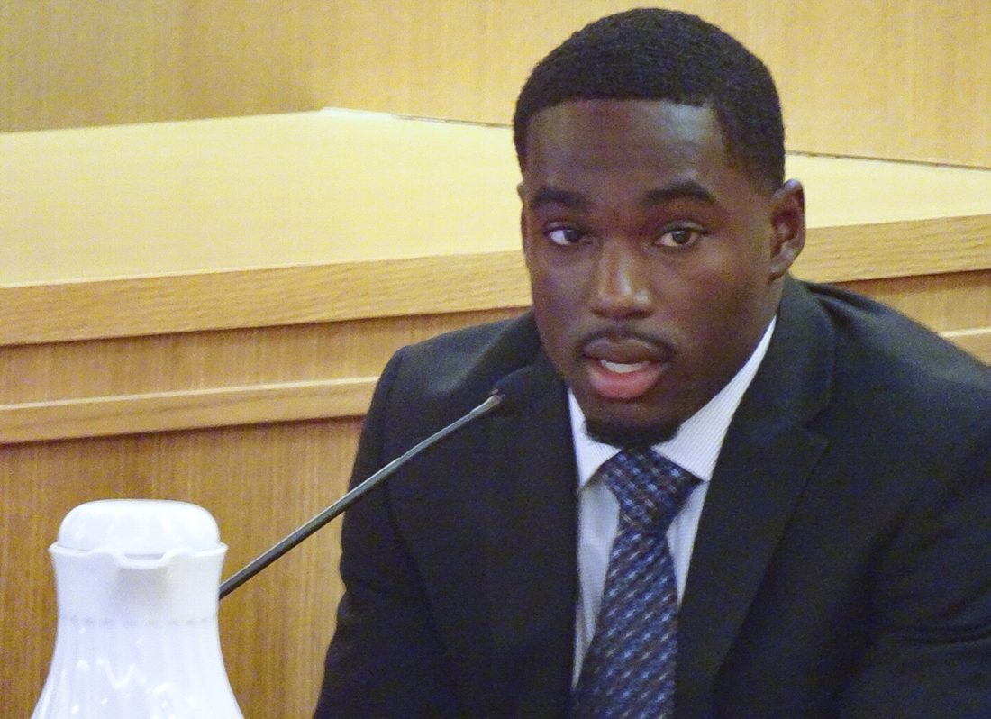 Former Wisconsin football player Quintez Cephus testifies during his trial, Friday Aug. 2, 2019, in Madison, Wis. Cephus has told jurors that the two women he is accused of sexually assaulting wanted to have sex with him. (Ed Treleven/Wisconsin State Journal via AP)